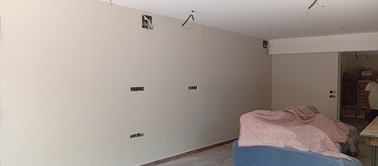El proyecto comenzó con un espacio recién reformado, con las paredes de pladur ya instaladas, pero aún sin el acabado final. Como se puede ver en las fotos iniciales, los tabiques mostraban las juntas y los empastes, y los cables eléctricos colgaban del techo y sobresalían de las paredes, esperando a ser ocultos para la instalación del televisor y otros enchufes.